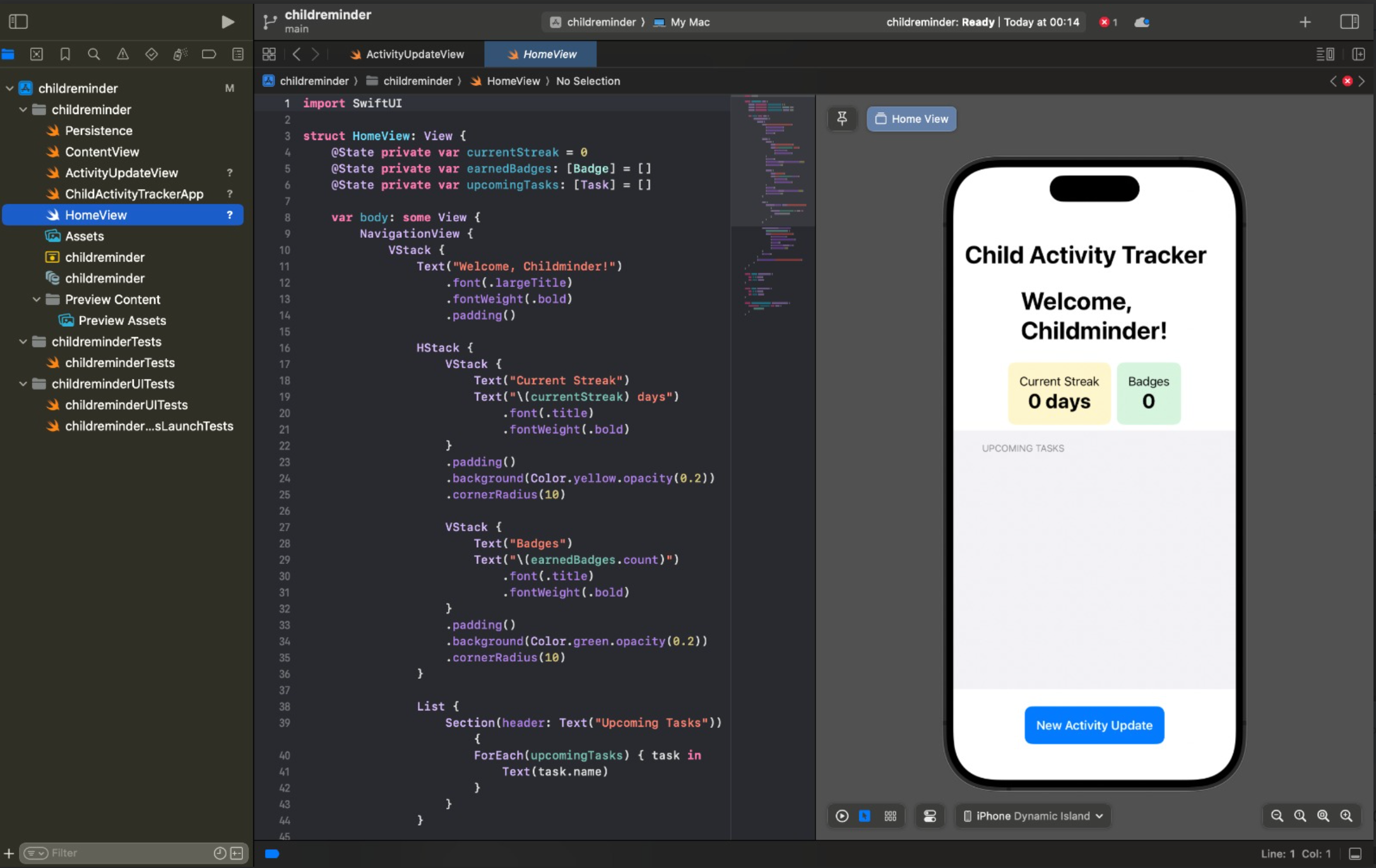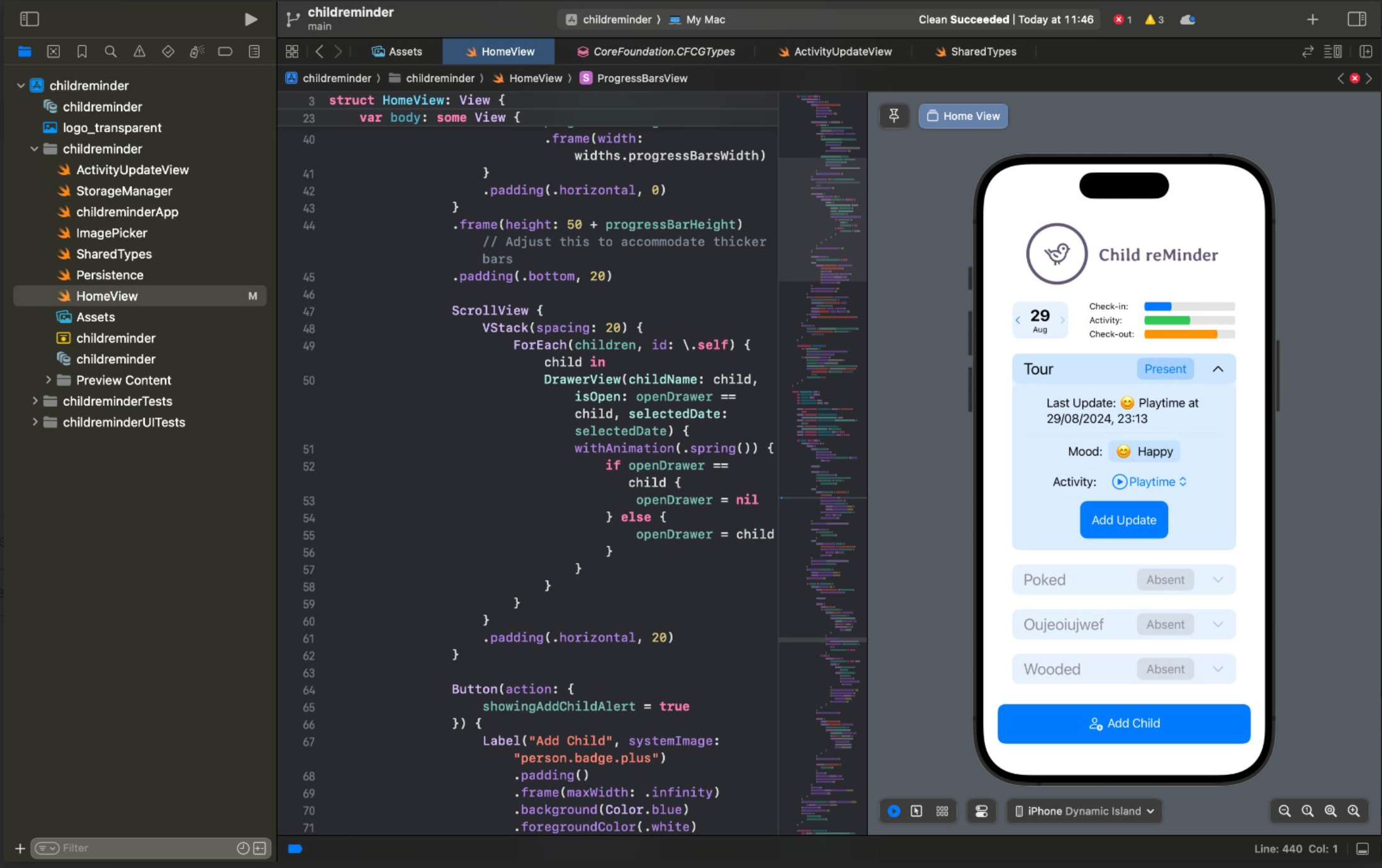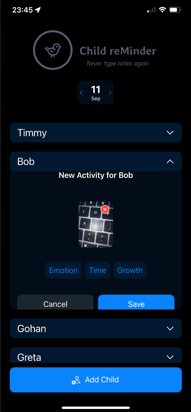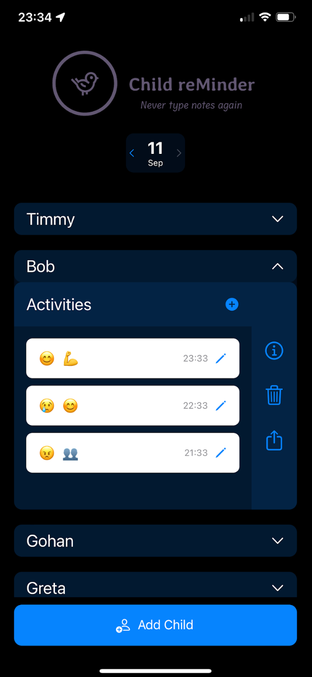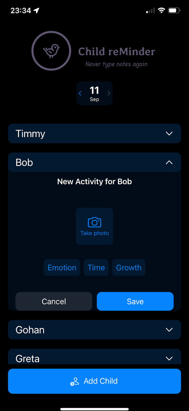 Complete this app in its entirety, ensuring a smooth and engaging experience for childminders to track children's activities efficiently and enjoyably.